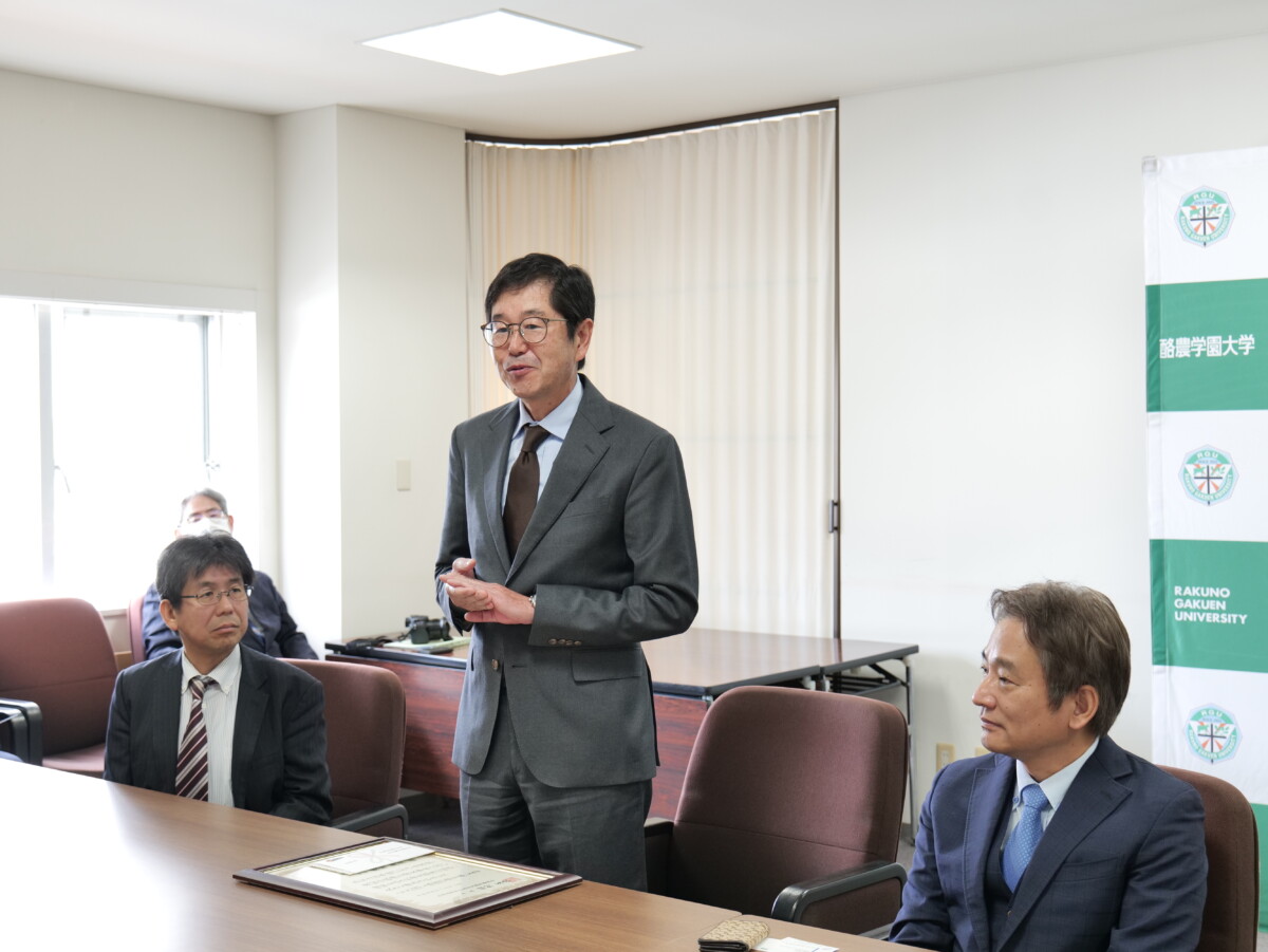 この度は誠にありがとうございました。今回、感謝状を授与していただいたことを非常に光栄に思っております。以前、4年間ほど農業改良普及指導員として生産現場の支援を担当したことがありました。その時間は、これまで携わった仕事の中で最も充実していて楽しい時間でした。その農業改良普及指導員時代にお世話になった農家さん達とのお付き合いは、今も続いています。農業改良普及指導員は、自己実現を体験できる仕事であると考えています。農業の現場で動いたときに良い仕事ができると、周りのみんなが喜んでくれることが非常に励みになりました。その想いを学生たちに伝えて、彼らもそういう現場で活躍してもらいたいと考えていました。そして、気づいてみると、研究室から農業改良普及指導員になってくれた学生は20名を超え、道内外あわせると30名が農業職の公務員となっていました。このことをとても嬉しく思っています。この度は、これまでの私の教育研究の姿勢をご評価いただいたことに感謝申し上げます。本日はありがとうございました。