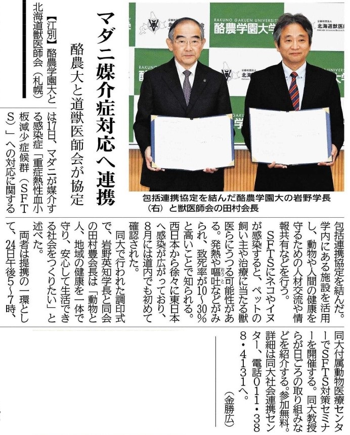 【北海道新聞】マダニ媒介症対応へ連携 酪農大と道獣医師会が協定