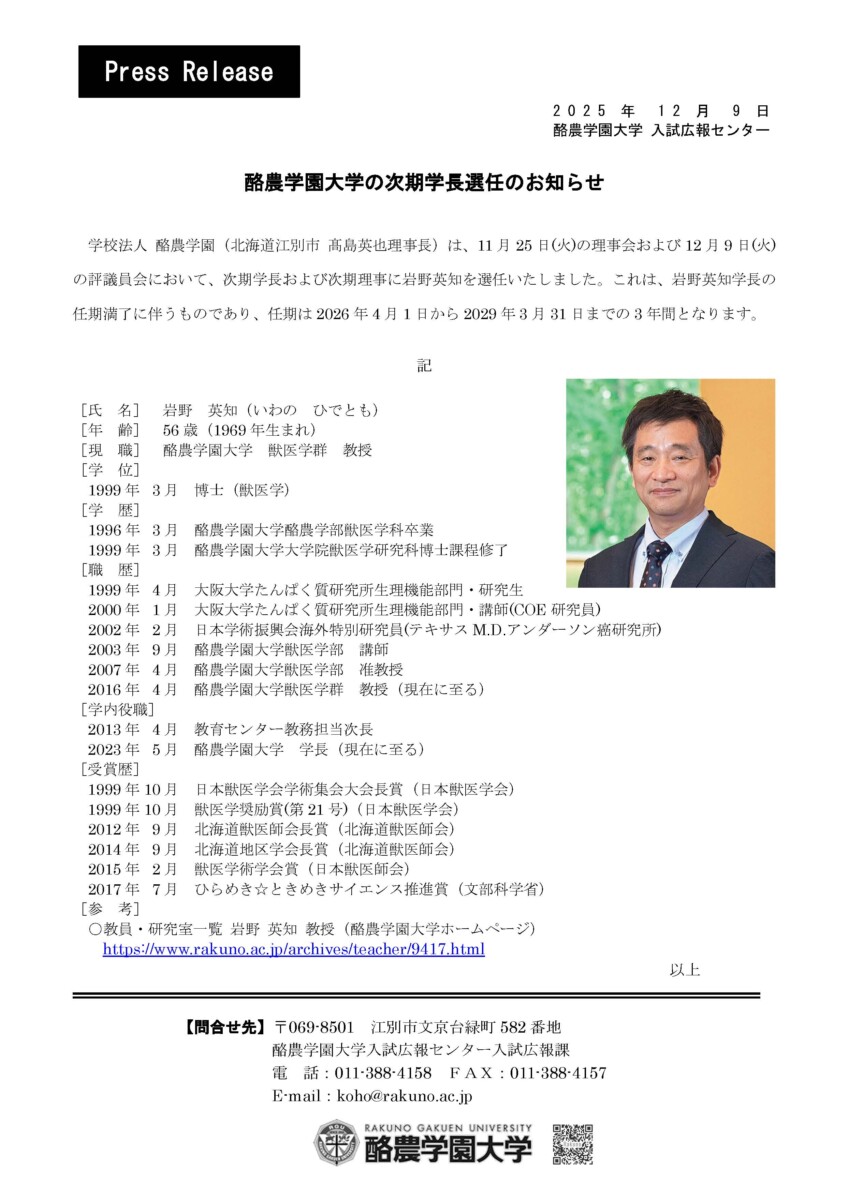 学校法人 酪農学園(北海道江別市 髙島英也理事長)は、11月25日(火)の理事会および12月9日(火)の評議委員会において、次期学長および理事に岩野英知を選任いたしました。これは、岩野英知学長の任期満了に伴うものであり、任期は2026年4月1日から2029年3月31日までの3年間となります。