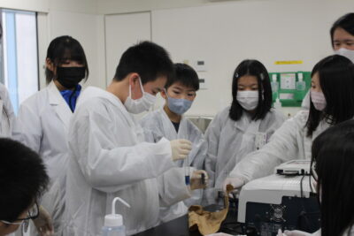 実習内では、講義やキャンパスツアーに加え、水環境分析や環境診断を本格的に体験しました。子どもたちは、環境キャンプで採取した水質試料や計測データを使い、塩分の断面図や平面図を作成し、さらに、栄養塩の分析では試薬づくりから分光光度計による測定まで自ら行いました。こうした実践的な取り組みを通じて、科学的な視点から自然環境を理解する力を養いました。ジュニアガイドの子どもたちは、研究室の学生と協働しながら、地域の環境課題や生態系保全の重要性について意見を交わし、未来の環境リーダーとしての第一歩を踏み出しました。