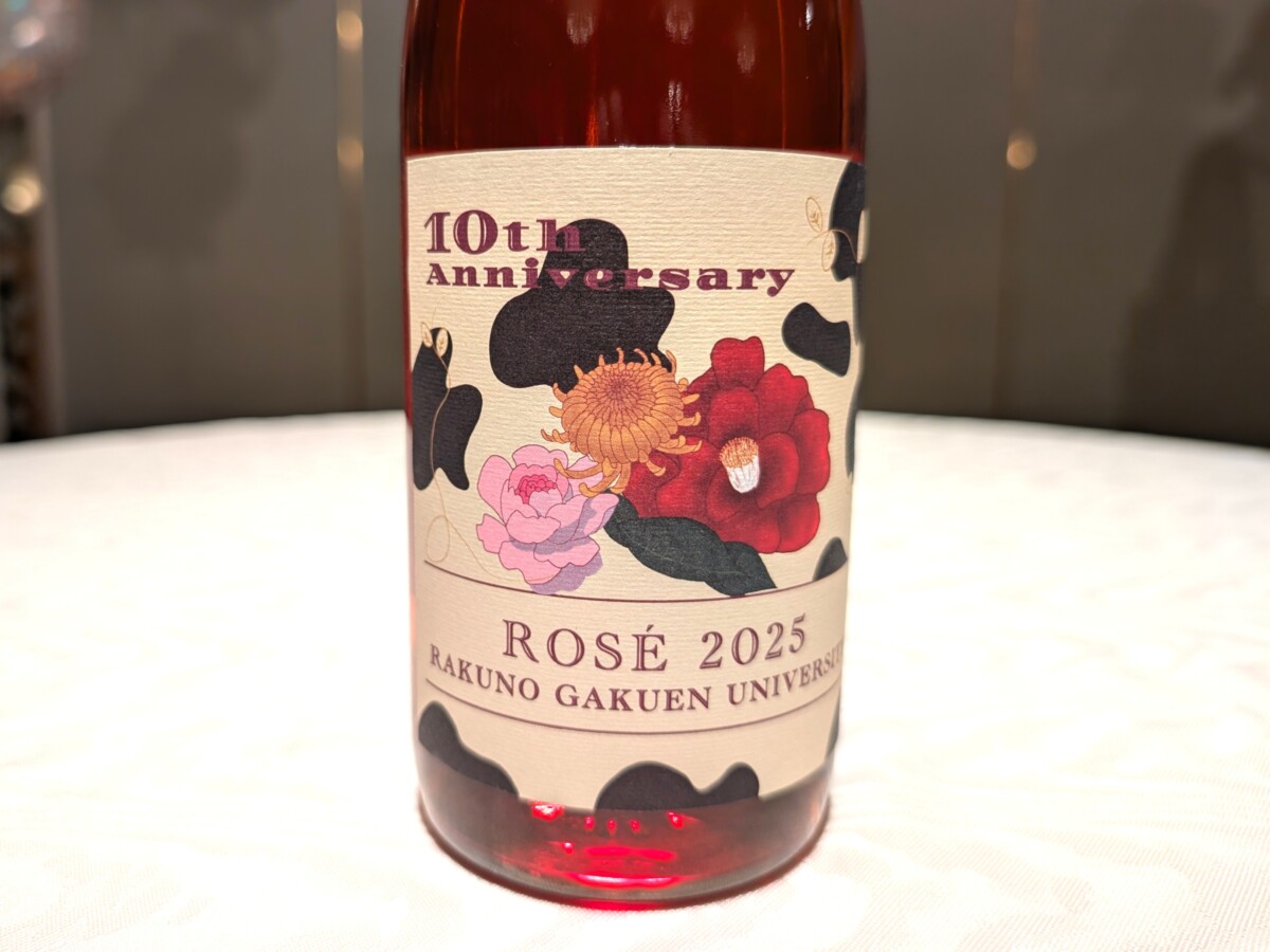 「今年はサークル設立10周年の節目の年ということで、“10th Anniversary”をしっかり前面に出したデザインにしました。これまでにない雰囲気にしたいと考え、ツバキ・ボタン・キクの3つの花を取り入れています。赤いツバキの花は『誇り』『控えめな優しさ』を表し、活動を通して感じた支え合いの大切さを込めました。ボタンは『壮麗』『誠実』『思いやり』の意味があり、栽培や人との関わりで大切にしたい姿勢を表しています。ピンクには『幸福』という意味もあり、“ROWP”に関わる皆さんへの願いを込めました。キクは江別市の花で、黄色のキクの花には『高貴』『信頼』『不老長寿』を意味します。背景の牛柄は酪農学園大学らしさと、キャンベル・アーリの圃場が牛舎横にあることに由来しています。ワインとともラベルのデザインも楽しんでいただけましたたら嬉しいです」