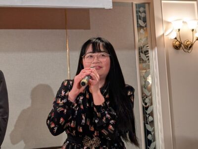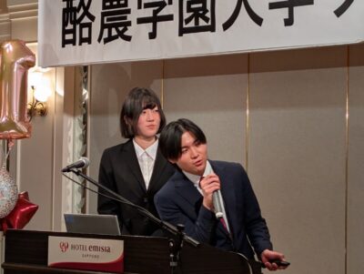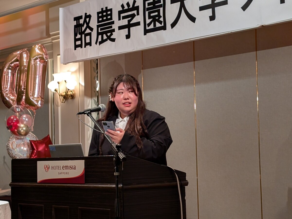 酪農学園大学ワインプロジェクト10年の軌跡として、卒業生によるスピーチリレーが行われました。これまで活動を支えてきた先輩たちが、それぞれの時代の思い出や挑戦について語り、その想いのバトンを現在活動する学生たちへとつなぐ温かい時間となりました。
