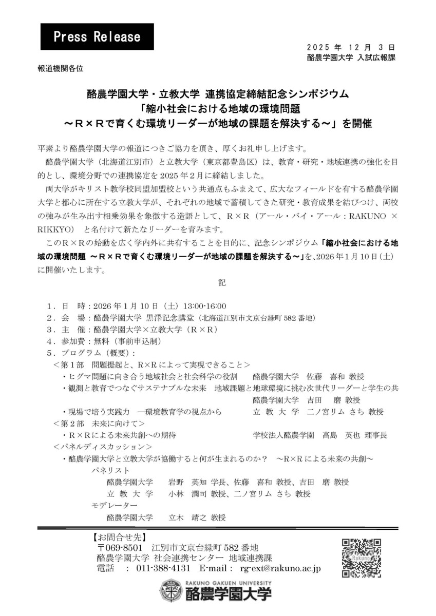 [プレスリリース]酪農学園大学・立教大学 連携協定締結記念シンポジウム 「縮小社会における地域の環境問題 ~R×Rで育くむ環境リーダーが地域の課題を解決する~」を開催