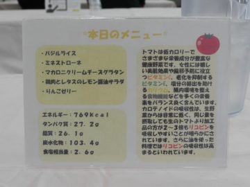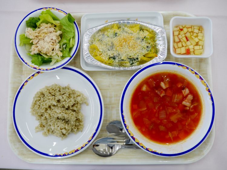 試食をした管理栄養士コース4年生は「バジルは苦手でしたが、このバジルライスはおいしくどんどん食べられます。ミネストローネとバジルライスがとっても組み合わせがよくて、バジルが寄り添ってる感じです!」「グラタンも塩分調整されているのにしっかりした味でした。塩2.6gでこの献立はすごいと思います」と話しました。