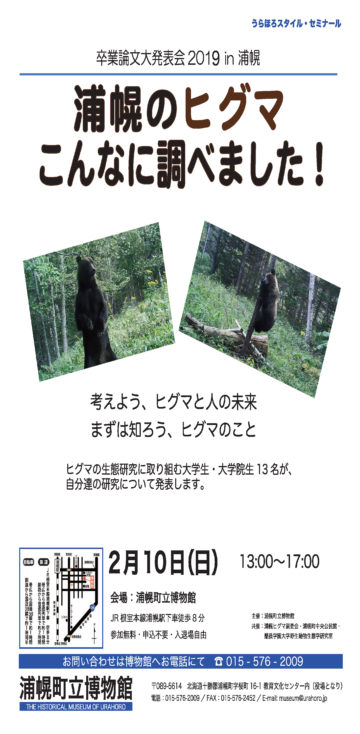浦幌町は、知る人ぞ知る日本のヒグマ研究のメッカです。毎年、本学の学生たちが町に滞在し、山中を駆け巡ってヒグマの研究に挑んでいます。今年も大学生や大学院生たちが、浦幌町立博物館で自分たちの研究成果を大いに語ります。