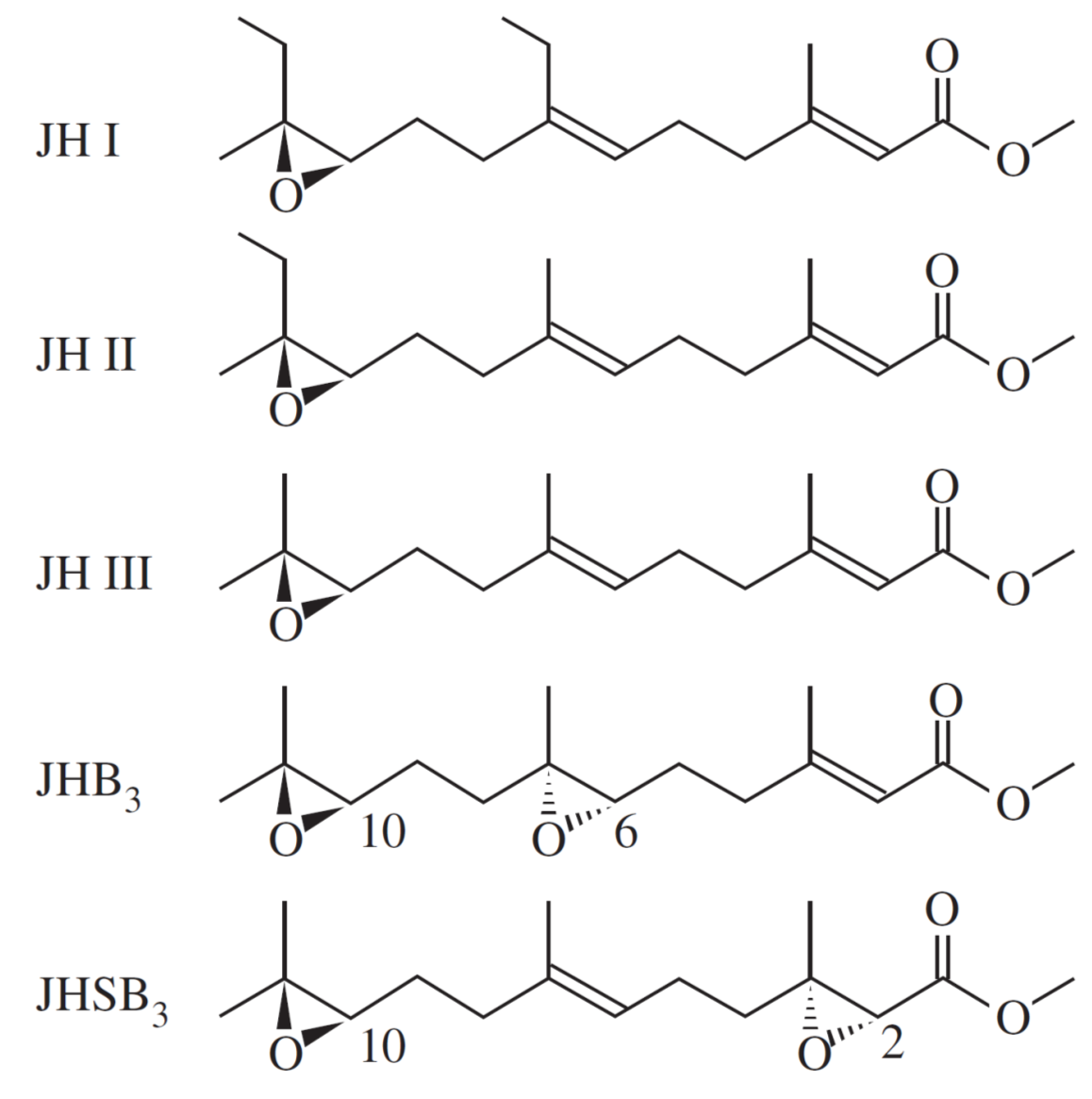 昆虫特有のホルモンであり、昆虫の分類群ごとに構造の異なる幼若ホルモンに標的とすることで、環境負荷の低い農薬の開発が期待されます。