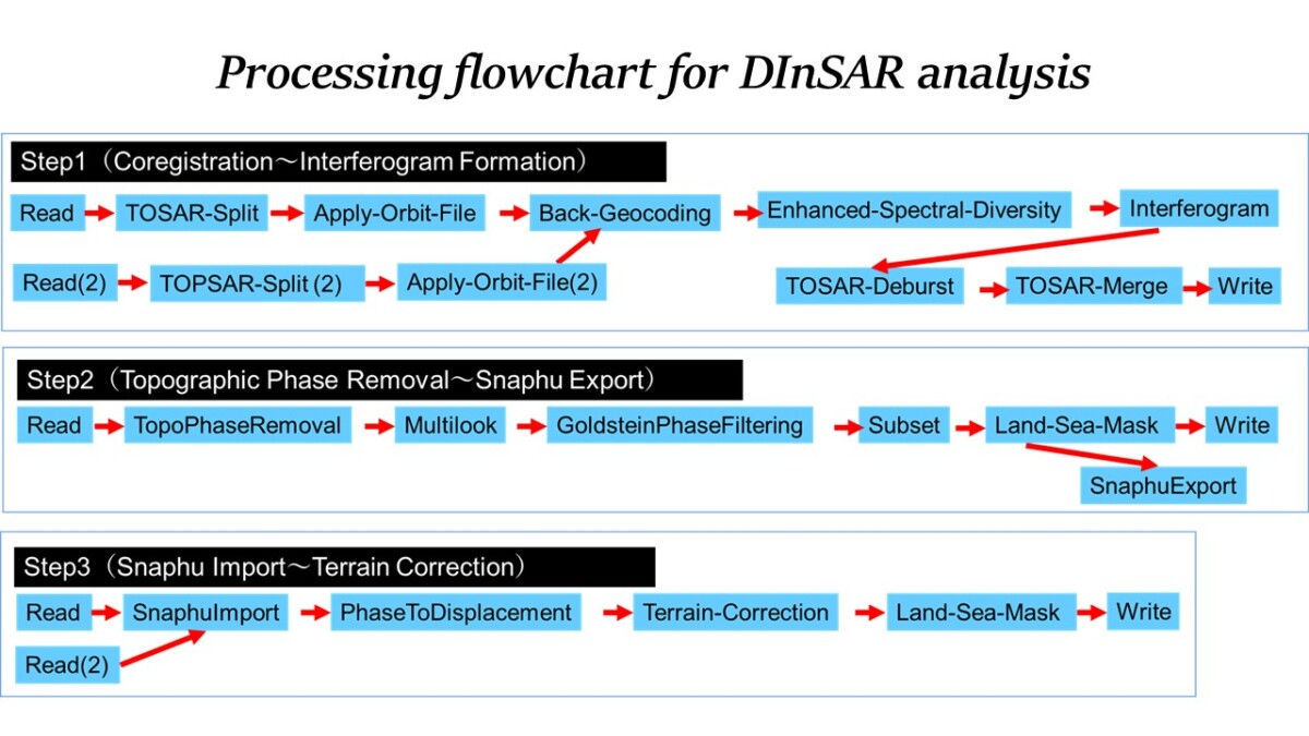 日本は、地震、台風などの自然災害が頻繁に起きる国であり、毎年地震とそれに伴う津波、台風による土砂崩れ、斜面崩壊などにによって多くの尊い命と国民の財産が失われています。我々の研究室ではマイクロ波衛星の合成開口レーダ(Synthetic Aperture Radar, SAR)のインターフェロメトリデータを用いて、InSARとDInSAR解析によって地震前後の干渉画像の位相差を算出することによって、広域における地表面の垂直変動をミリメートル単位で検出する方法を提案しています。また、森林密生地域における土砂崩れの場所の検出ではInSAR技術によって高精度で斜面の崩壊箇所の検出に成功しています。本研究はIEEE IGARSS2023の国際会議で発表して、多くの参加者の関心を寄せています。処理過程(フロー):全部で三つのステップを踏む必要だが、ESA (The European Space Agency)の(c)SNAPソフトウエアとハーバード大学から開発されたSnapHuExportの組み立てから実現可能である。