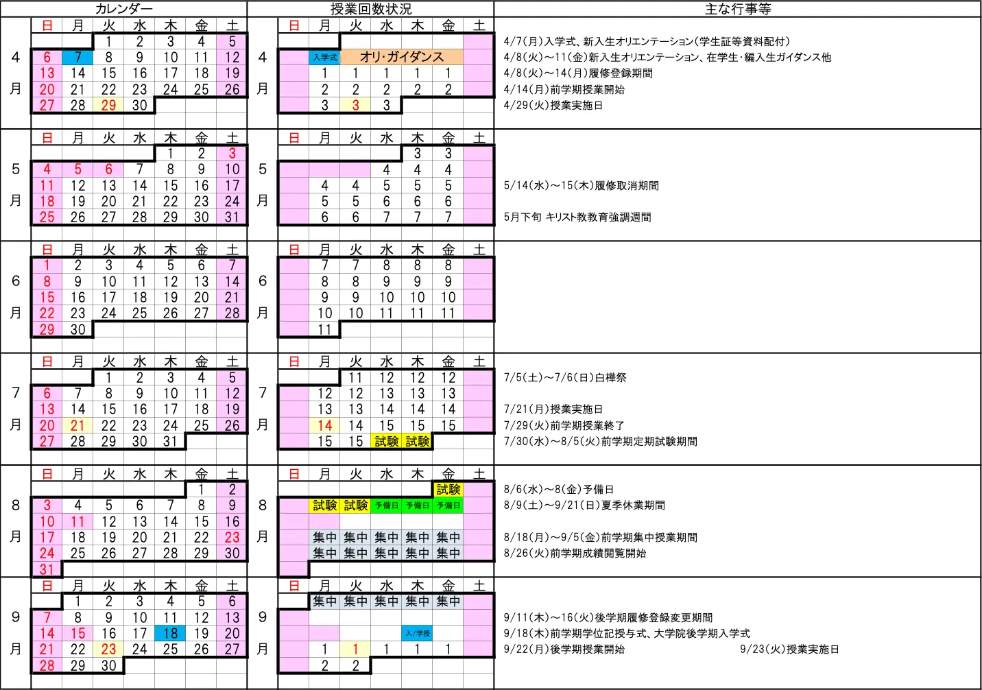 2025年度学事暦 前学期授業期間(4月14日~8月8日) ■ 休業日 ■ 定期試験日 ■ 予備日 ■ 授業実施日 ■ 入学式・学位記授与式 ■ オリ・ガイダンス ■ 集中授業 ■ 休講日 後学期授業期間(9月22日~2月2日) ■ 休業日 ■ 定期試験日 ■ 予備日 ■ 授業実施日 ■ 入学式・学位記授与式 ■ オリ・ガイダンス ■ 集中授業 ■ 休講日 2025年度PDFダウンロード 過去の学事暦 2024年度PDFダウンロード 2023年度PDFダウンロード 2022年度PDFダウンロード 2021年度PDFダウンロード