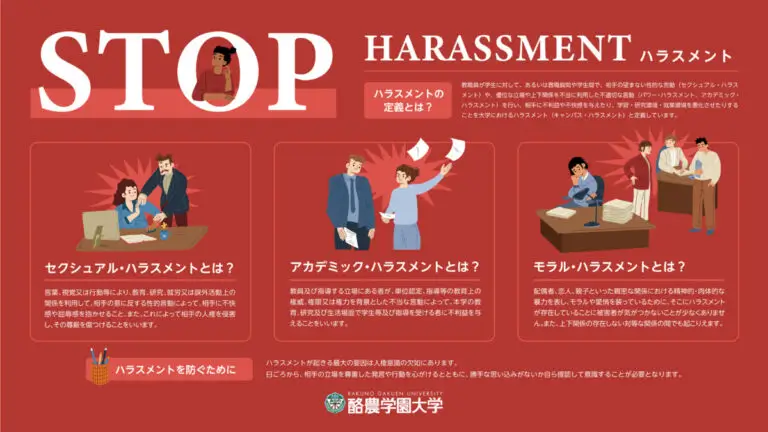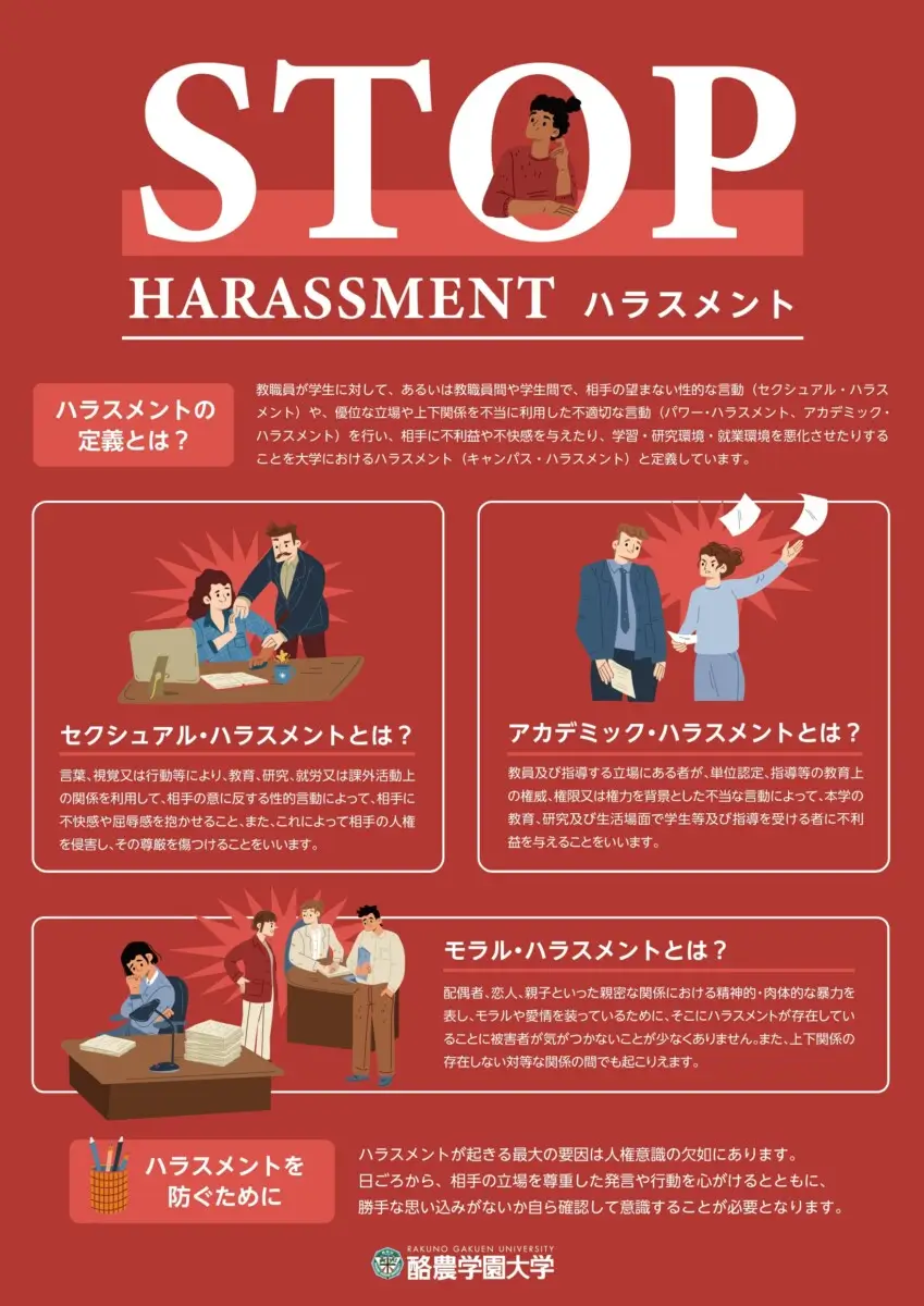 教職員が学生に対して、あるいは教職員間や学生間で、相手の望まない性的な言動(セクシュアル・ハラスメント)や、優位な立場や上下関係を不当に利用した不適切な言動(パワー・ハラスメント、アカデミック・ハラスメント)を行い、相手に不利益や不快感を与えたり、学習・研究環境・就業環境を悪化させたりすることを大学におけるハラスメント(キャンパス・ハラスメント)と定義しています。